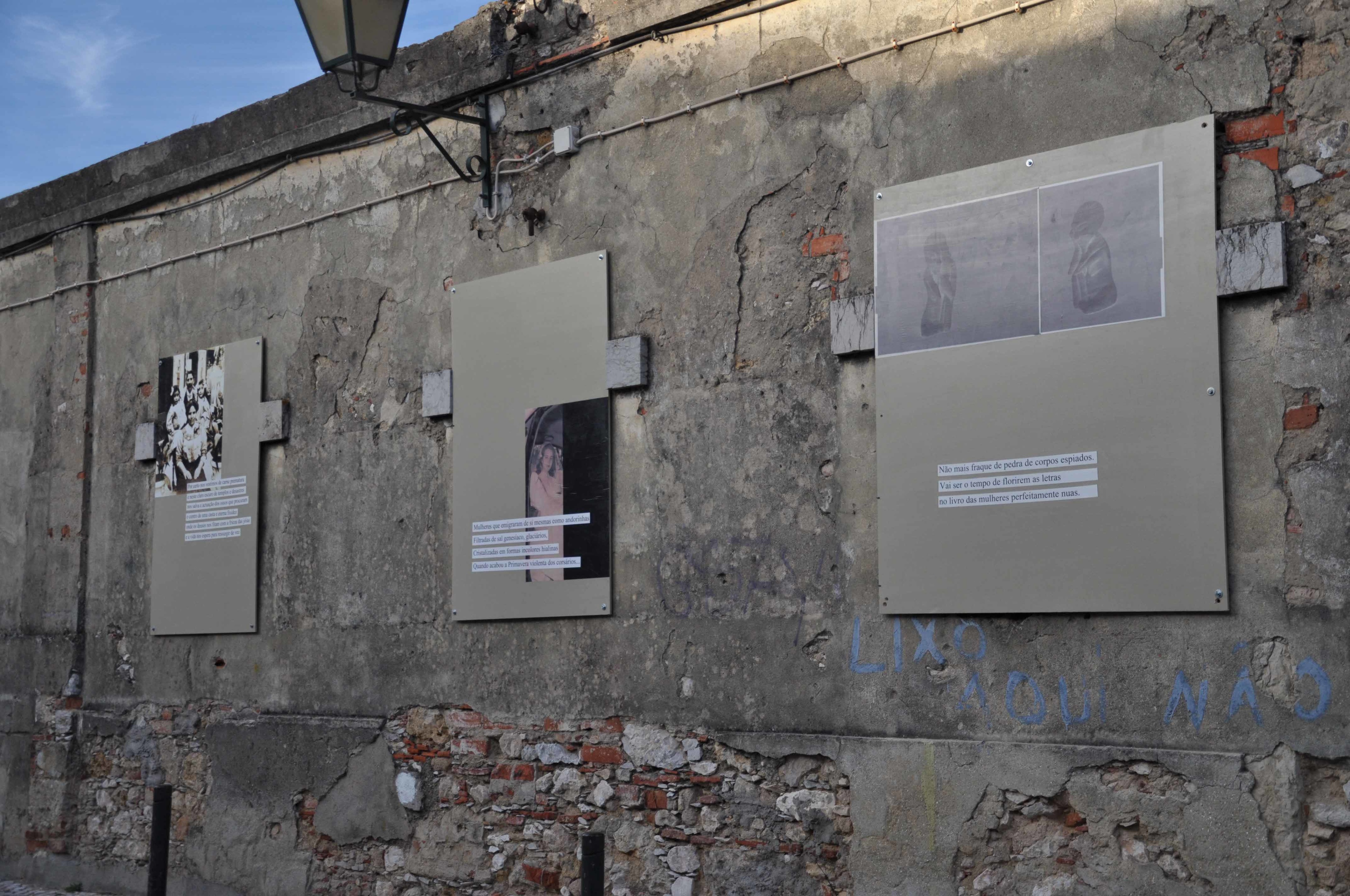 To things finally quiet combines reproductions of ancient photographs of dwellers of the Estrella d’Ouro neighbourhood (built in 1908), with excerpts of poems by Natália Correia. I wanted to preserve fragments of personal memories and inscribe them in the territory, celebrating at the same time the work of the poetess. The research for this installation was carried out with the older dwellers of the neighbourhood and with some of the patients of the retirement home Casa Nossa Senhora da Vitória. In two panels I used photographs of wood sculptures by Tó, one of the patient of the retirement home. Thanks to Dona Ana, Tó, Miguel Vidal and Isabel Braga.